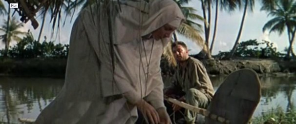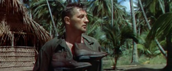 It’s 1944, somewhere in the South Pacific. Corporal Allison (Robert Mitchum), of the United States Marine Corps, is drifting along in a rubber raft after the submarine he was on came under attack while he and his colleagues were transferring to rafts for an assault. Allison is all alone when he washes up on a small island. He wanders around, getting his bearings…
