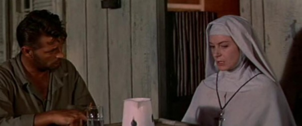 Allison consumes most of the bottle, and ends up telling Sister Angela that the island’s a bit like the garden of Eden, with just the two of them—Adam and Eve—around. Not much point her being a nun, is his view. She’s so shaken up by what he says, she runs out into the rain and spends the night outside, catching a bad chill and fever in the bargain.