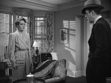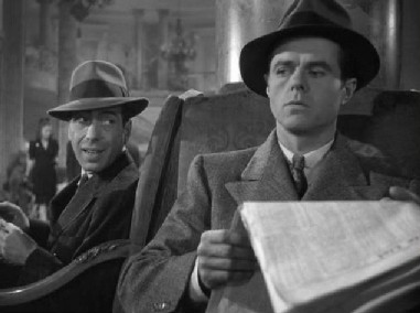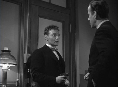 Back home, Spade telephones Effie to ask her to inform Archer’s wife, Iva (Gladys George). He’s still mulling over the day’s happenings when he receives visitors: two police detectives who come with the news that Thursby has been murdered. They make it pretty obvious that they suspect Spade. After all, it looks like Thursby killed Archer, so Spade probably struck a blow for his slain friend.