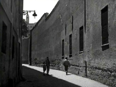 Bruno. On one of my earlier posts, a reader had posted a comment about films in which a secondary character actually is, in essence, the main character. Bruno is like that. Antonio is, obviously, the main character, the man desperate to retrieve his lost bicycle. But Bruno, caught in the maelstrom in which his father finds himself, is dragged along everywhere (even to a brothel) and is a key participant in much that happens—especially the climax. His character’s excellently drawn: a child, certainly, but in ways a child who’s had to grow up before his time. And the 7-year Enzo Staiola portrays Bruno perfectly. Interestingly, this was Staiola’s first film—De Sica (supposedly on the basis of Staiola’s walk—a delightfully slouchy one) picked him up off the streets of Rome for the role. He makes not just a very cute kid, but turns in what I’d rate as one of the best performances by a child actor that I’ve ever seen.