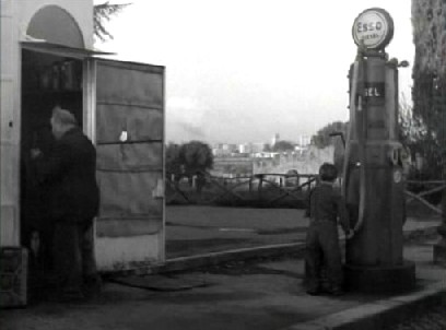 [Aside: The scene where Antonio drops Bruno off at the petrol pump is, for me, one of the many subtle indications of poverty in the film. When Bruno got off Antonio’s bicycle, I thought this was school—until the little boy went off into a shed and began taking out a funnel and pipe and whatnot. A little kid, who should have been in school, but instead, is working.]