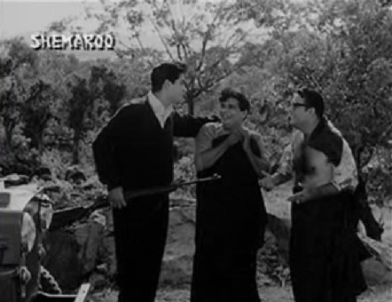 The story starts off promisingly enough, in November 1947. In Kashmir, the insurgent Kabaalis are raising hell and the Indian army is trying to drive them back. Lieutenant Ajay Mehra (Joy Mukherji) has been deputed to infiltrate Kabaali territory in the area near Baramullah to gather intelligence. Ajay’s two guides, Seedha Ram (Dhumal) and Ulta Ram (Rajendranath) take him into the area; Ajay changes into civvies and heads into Kabaali zone.