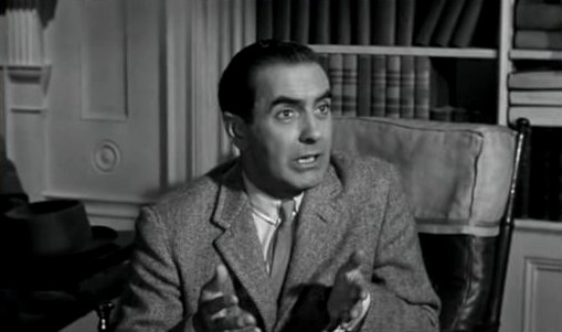 As that paragraph from Ms Christie’s story tells it, the tale is of the trial of Leonard Vole (Power) for the murder of Emily French (Norma Varden). Vole’s solicitor, Mayhew (Henry Daniell) comes with Vole’s case to the crusty old barrister Sir Wilfred Robarts (Charles Laughton, in what I think is one of his best roles). Robarts is initially reluctant to take on the case—he’s just come home after four months of hospitalisation after a heart attack—but eventually agrees.