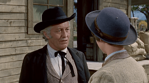 The next morning, Mattie goes off to meet Colonel Stonehill (Strother Martin), the man from whom Frank Ross had bought four ponies. Mattie begins by telling him she wants to sell him back the ponies, and when he refuses, she points out, “My father bought those ponies for breeding. Now, I’ve had a look at them, and they’re all geldings.” (A sweet smile here). “You can’t breed geldings.”