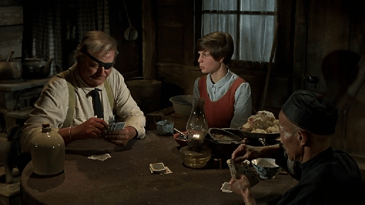 Cogburn lives in the back of a small Chinese shop owned by Chen Lee. Over supper and a game of cards which follows, Mattie does succeed a bit in wearing down Cogburn’s resistance, and he finally tells her his price is $100 (“and that’s the children’s rate”). Mattie says she’ll think about it, and let him know her answer the next day.
