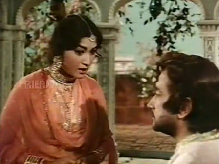 …and do so using pigeons to carry their verses between Gujarat and Agra. Time passes, and Jahanara (now Mala Sinha) has grown up. She is still enamoured of Mirza Changezi’s (now Bharat Bhushan) poetry. So much, in fact, that when he finally comes back to Agra and presents himself at court, it doesn’t take the two of them long to realise that their childhood friendship has blossomed into love.