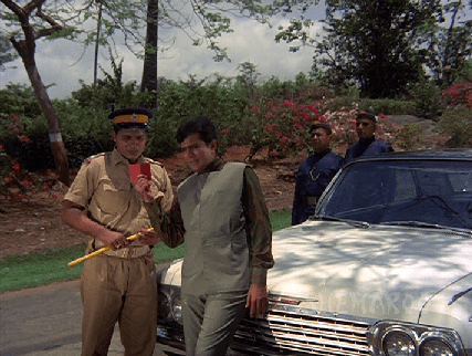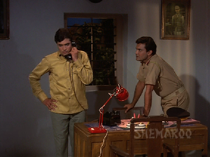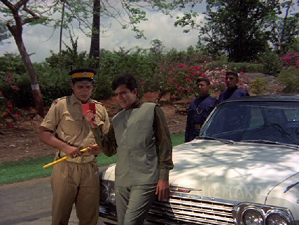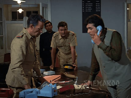 A group of cops arrive just as Neeta and Shyam finish their cavorting and the last verse of their song. [How considerate of the cops to wait]. Shyam bundles Neeta into a cab – he, by the way, has told her he’s a student of art, not a cop – and then shows his ID to who are, in effect, colleagues. They tell him that someone using Shyam’s car number plate has pulled off a jewellery heist – the one at Hiralal’s – and so could Shyam please come to office.