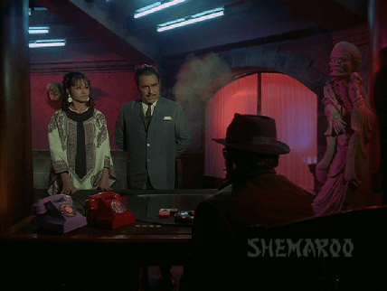 [Why did the baddie really phone Shyam? No self-respecting cop, especially if he’s a Hindi film hero, will be deterred by such milk-and-water threats. The only point seems to be that it gives our hero a clue].
