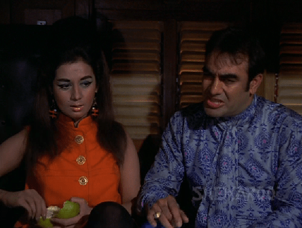 Once seated, he finds that he doesn’t have the compartment to himself; he’s joined by a somewhat loud but good-natured man named Pyarelal (Rajendranath). And that isn’t all; shortly after, another passenger enters. This is a blingy, overtly flirtatious girl who calls herself Kalavati (Nanda, again). She soon sets about flirting with Pyarelal and sharing an orange with him.