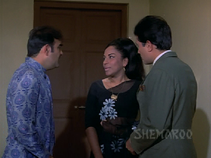 I watched this movie when I was 11 and loved loved loved it. The songs are lovely. I think the whole Nanda-on-the-train thing happens because Helen has fallen for Rajesh and wants to turn him against Nanda. In fact, Helen seems to be quite a mover and shaker in this movie, getting the boss to agree to her plans over the ones of Madan Puri/Shetty.