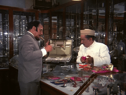 At this point, a phone call comes for the Nawab Sahib, whose Begum it is. Begum Sahiba tells her ‘husband’ that she wants to buy an imported American car, and she’s seen the perfect one. Only, the seller wants cash – a lakh. He won’t take a cheque. When Nawab Sahib decides he’ll buy the diamond later and give this cash for the car instead, Hiralal (who’s been eavesdropping avidly on the conversation) sees a big sale slipping away, and offers to accept a cheque for the diamond.