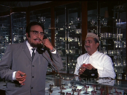 Soon after, the accomplice, now wearing (besides that smirk) also a wig and fake beard and whatnot, passes himself off as a wealthy Nawab at the shop of a jeweller, Hiralal (Sundar). The Nawab Sahib asks to see Hiralal’s best diamond – what looks like a bit of glass to me, and not very sparkly either – and on discovering that it’s worth a lakh, doesn’t bat an eyelid. Instead, he opens his briefcase (brimming with currency notes) and gets ready to pay Hiralal.