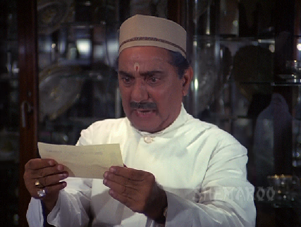 Shyam, who (as per his promise) has dropped by to meet Neeta’s mum, overhears this damning conversation from outside the window, and is even more aghast when there’s a thunderous knocking at the front door and Neeta opens to find – daddy! Ram Dev has escaped from jail, and has come to collect his wife and daughter so that the trio can run away together, somewhere where they won’t be traced.