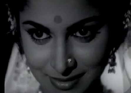 4. Badle-badle mere sarkar (Chaudhvin ka Chaand, 1961): A change of style, pace, mood – everything. Here Waheeda plays the young bride, crushed and confused by the sudden change in her husband – from a devoted lover (who called her a Chaudhvin ka chaand), to one who spurns her. There is pain in the lyrics and in Lata’s voice, but it is the pain Waheeda Rehman manages to bring into her face that moves me. Especially in that first frame, where her eyes, brimming with despair, seem to fill the screen. Beautiful, and so immeasurably sad.