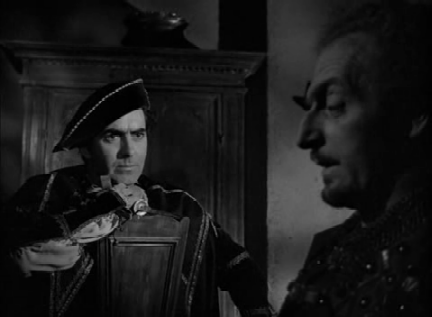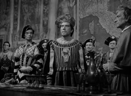 The settings. Prince of Foxes was shot completely in Italy (in fact, even some of the indoor scenes were shot on location in Italian palaces, including one that Cesare Borgia occupied). It’s a panorama of fantastic murals, vast domed ceilings, heavily carved furniture, and beautiful mosaic floors – and the outdoors are, of course, everything from the canals of Venice to the mountains, with their cypresses and castles. The only regret is that it wasn’t shot in colour. (The possible reasons put forward for that seem to range from somewhat unlikely ones like there being no colour cameras in Italy when the crew arrived for filming, to the much more likely one that there was a shortage of funds).
