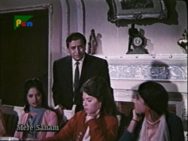 Nasir Hussain and Achla Sachdev as Mr Mehra and Savitri Devi. These are two of the worst onscreen parents I have ever come across: they’re unbelievably selfish, rude and hypocritical people who go to crazy lengths to govern their offspring’s (or ward’s) lives. Achla Sachdev is whiny in the extreme here, by the way – not a problem when she’s acting as the quavery and loving mother in other films, but very irritating in Mere Sanam.