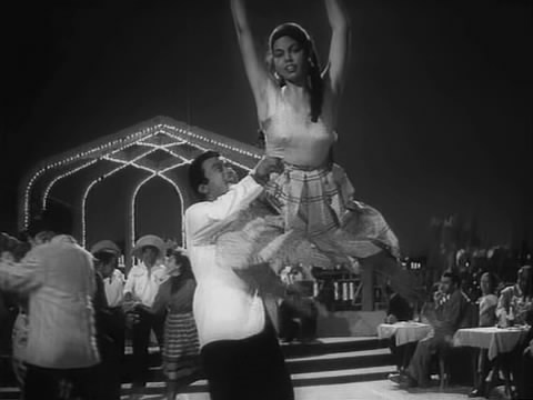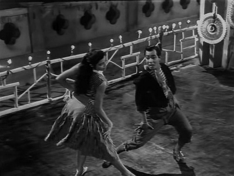 Edwina’s in many songs with Helen. One of my favorites is from one in very bad quality, one that’s high on my list of films I’d most like to see in decent quality. The 1962 film Hong Kong is a feast for Helen lovers as she has something like six dances in it, most of them in color, and she’s the second female lead. In this black and white number Edwina wears a dark skirt with a light colored patterned blouse, and has her hair in two braids.