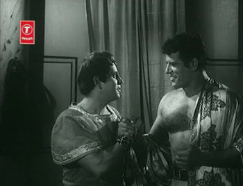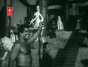 Dara Singh. Rustom-e-Rome is one of those films where he doesn’t get much to do except wrestle and show off his muscles—even Firdaus’s romancing of the heroine takes second place. Yet, even when he’s throwing punches or hoisting opponents on his shoulders and whirling them around till they’re dizzy, there’s a beguiling, endearing charm about Dara Singh that is very sweet. [Yes, I know. Calling a man who’s that tall and that broad ‘sweet’ is odd. But you just have to see his smile and his eyes, and listen to him speak with that Punjabi accent, and you’ll know what I mean].