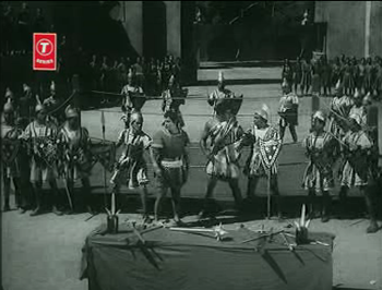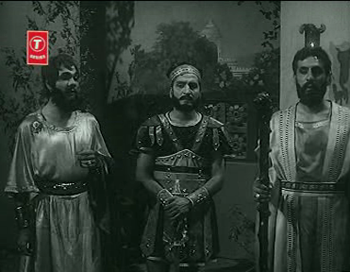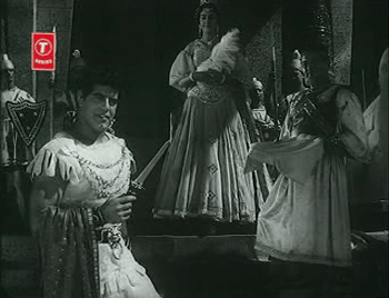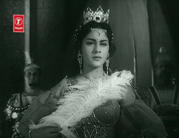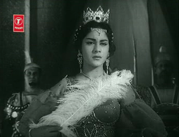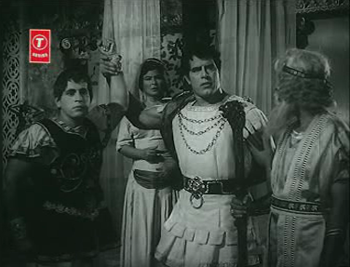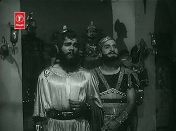 Rustom-e-Rome begins in the midst of an invasion. The kingdom of Chhaama [Jaama? It’s not very clear, and it certainly doesn’t sound like any place I’ve heard of] has been attacked by enemies—who, we don’t know. They’ve laid Chhaama/Jaama low, along with its king, who stumbles back into his palace just in time to tell the distraught queen (Rajrani?) that all is lost. The king’s sole regret as he’s gasping his last, is that if only Suleiman had been here—“Who is Suleiman?” asks the queen. “Suleiman is my—” the king begins to blurt out, and then cops it before he can impart that secret.