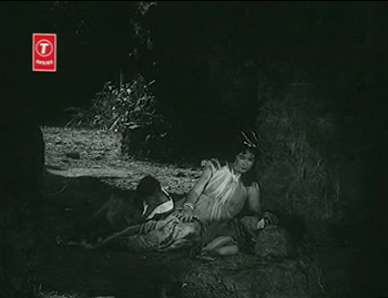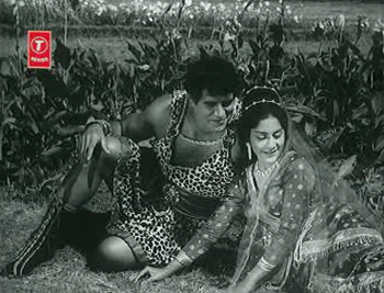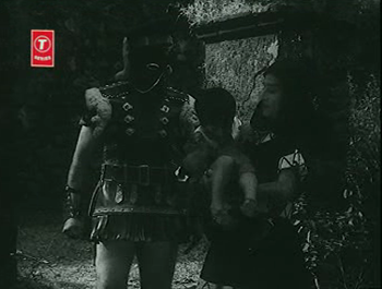 Once again, Darvesh Baba intervenes. Give Firdaus a day to search for Ruma, he pleads. So, after some cribbing, Firdaus is allowed till sunset to find and bring back Ruma. If he doesn’t, he’ll be put to death. [Nobody stops to think that Firdaus, if he has an ounce of sense, won’t come meekly back to be executed, if he can’t find the princess]. So Firdaus and his friend Naatu (Sundar) go off into the wild, towards the lair of the masked bandits, to look for Ruma.