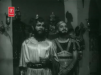 We don’t get a chance to learn why the sight of the dagger has shaken Firdaus so, because just then, an interloper appears. This is Arsalan (Azad), who claims that the contest is not over—he is here to defeat Firdaus. [In a later scene set in the camp of the masked bandits, we learn that Arsalan is the younger brother of Firdaus, whom the leader of the bandits had decided to bring up. How he’s parted ways with them isn’t explained].
