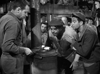 For example, Sefton has rigged up a ‘bar’. He, along with the rather timid Sergeant Harvey Cook ‘Cookie’ (Gil Stratton) uses discarded potato peels to brew a ghastly liquor. Ghastly it may be, but the men are more than willing to pay for it with the cigarettes they get as part of their Red Cross parcels.