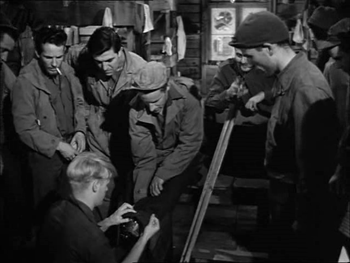 Someone warns Bagradian and Dunbar to keep quiet—if the ‘stoolie’ in the barracks is within earshot, chances are the Germans will soon be informed of Dunbar’s sabotage.