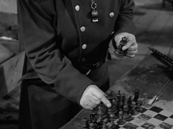 … and picks up the black queen from the chessboard lying on the table. He replaces the queen with an identical one he pulls out from his own pocket, and then he leaves.