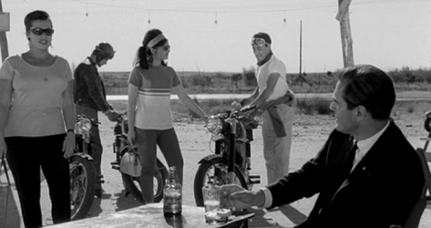 We get another insight into what’s happening to an increasingly restive Ramiro when he stops one day near a roadside tavern for a beer. A couple of men come by on scooters, each with a young woman riding pillion. While the men are inside the tavern, Ramiro unblinkingly stares at the women – he is so blasé about it that they notice, and giggle to themselves, whispering about him – and he still doesn’t look away. There is more than a hint of a man who is being forced into celibacy, and does not like it…
