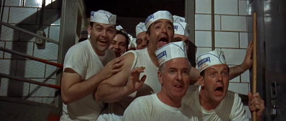 The men at the bakery, whom Charly fondly believes are his best buddies, take advantage of his simple-mindedness to have a laugh at his expense whenever they can. For example, they fill Charly’s pail with a yeast-laden dough and bung it into his locker—so that when, at the end of the day, Charly goes to his locker, yeasty dough is spilling out all over.