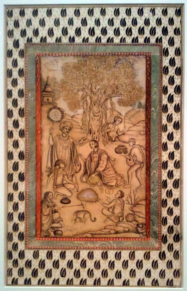 Another interesting angle on paintings is the literary one. Since books at the time were often illustrated, there’s a wealth of exquisite excerpts from manuscripts here. Some are classics, very well-known and well-loved works from Mughal libraries: Sa’adi’s ‘Bostan’ and ‘Golestan’, the ‘Hamzanama’, the ‘Baadshahnama’, ‘Akbarnama’, ‘Jahangirnama’, and ‘Baburnama’, and some gorgeously painted, gold leaf-embellished sections of the Quran.
