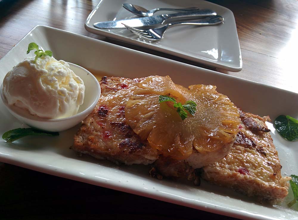 Coconut French toast, served with caramelised pineapple and vanilla ice cream.