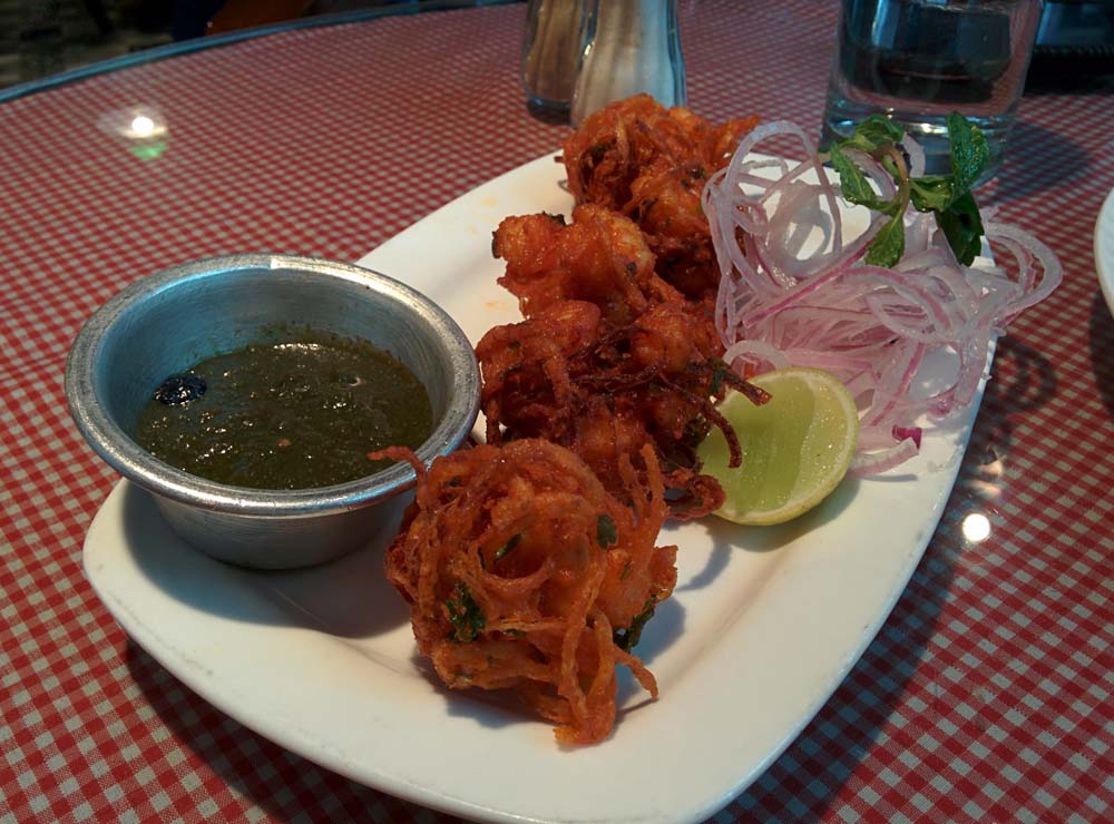 First up were the fried prawns. These were a little like onion bhajjis: lots of sliced onions had been mixed into a lightly spiced chickpea flour batter, along with small prawns, and spoonfuls of it had then been deep-fried. The succulence of the prawns, combined with the crunch from the onions, the very small but crucial amount of chickpea flour to bind it all together—all good. This came with a side of sliced raw onions and a little green coriander chutney.