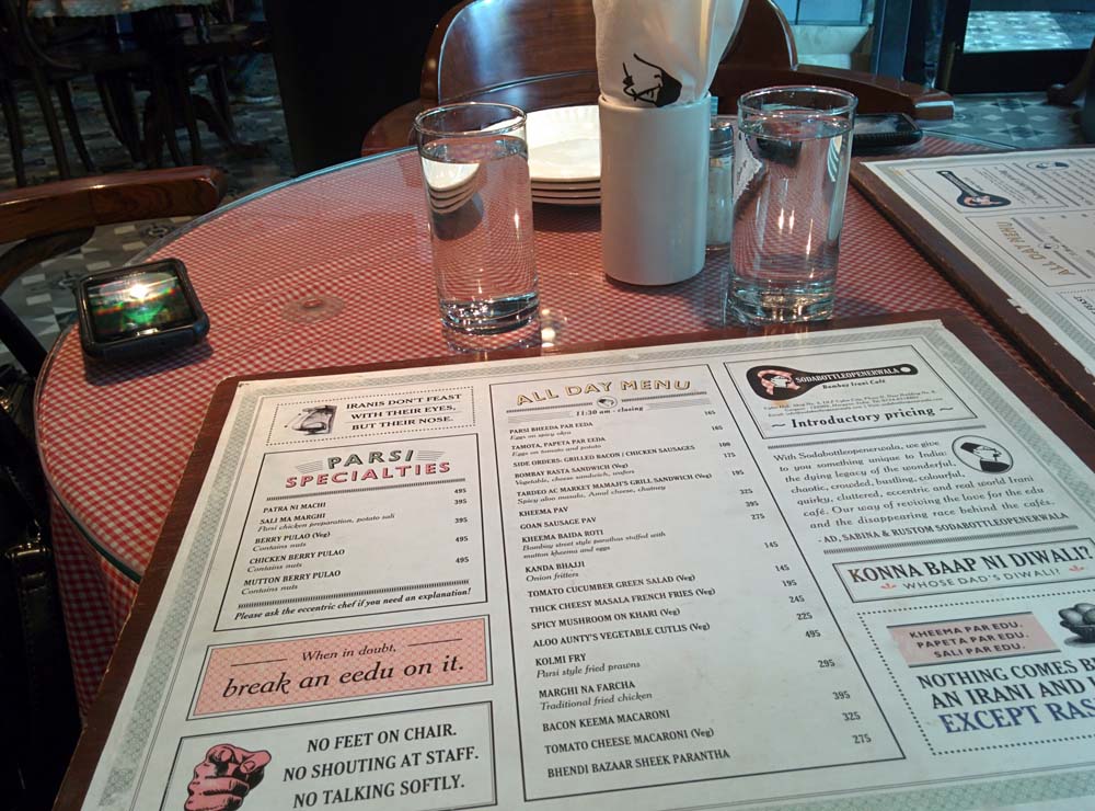Let me begin with a disclaimer: I’ve never been to one of those classic Bombay Irani cafés. I’ve heard praises (and seen photos) from friends in Bombay, though, and they’ve invariably waxed eloquent. When I heard, therefore, that a Parsi restaurant had opened in Gurgaon (and with the deliciously appropriate name of Soda Bottle Opener Wala, too!), I began clamouring to go there for a meal.