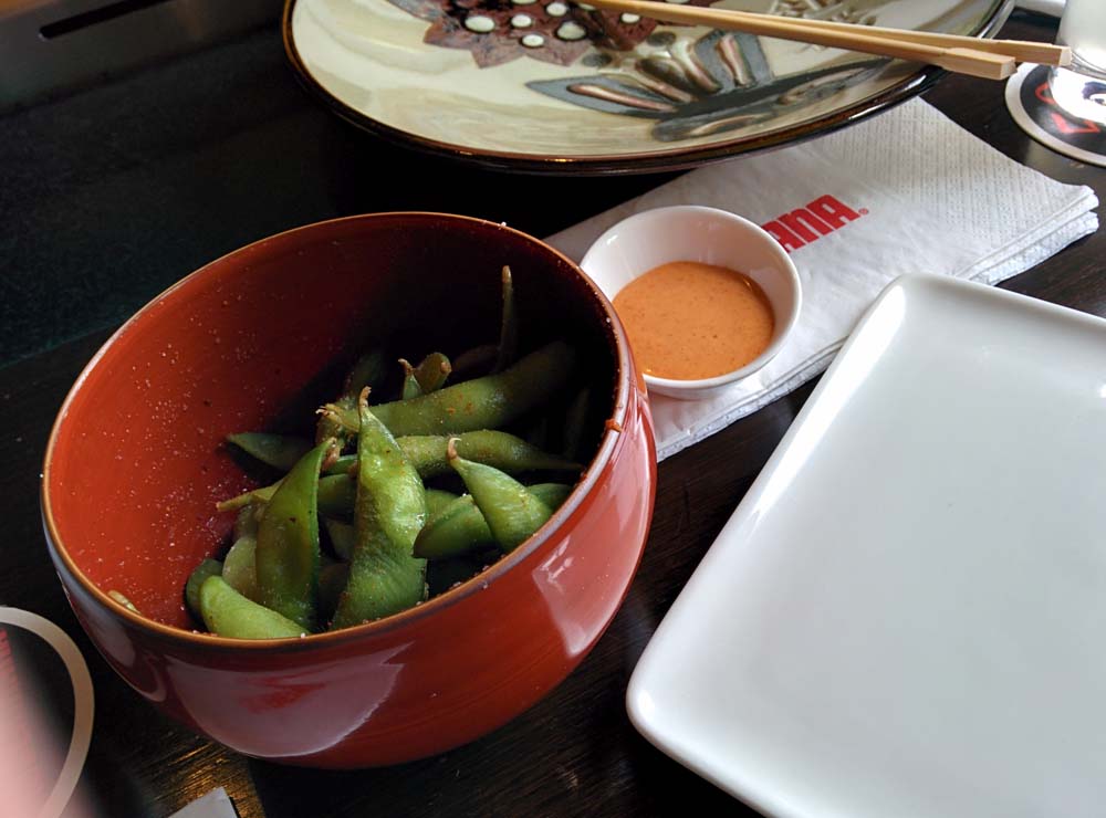 The edamame—whole pods, lightly steamed and now at room temperature—were served, lightly dusted with a barely-spicy powder. On the side came a spicy mayonnaise as a dipping sauce. Not bad, but if somebody ordered this hoping for the ‘dynamite’ promised in the menu, they’d have been disappointed. My husband and I later agreed that we’d also have liked it more if the edamame had been removed from their pods, sparing us the bother of doing so.