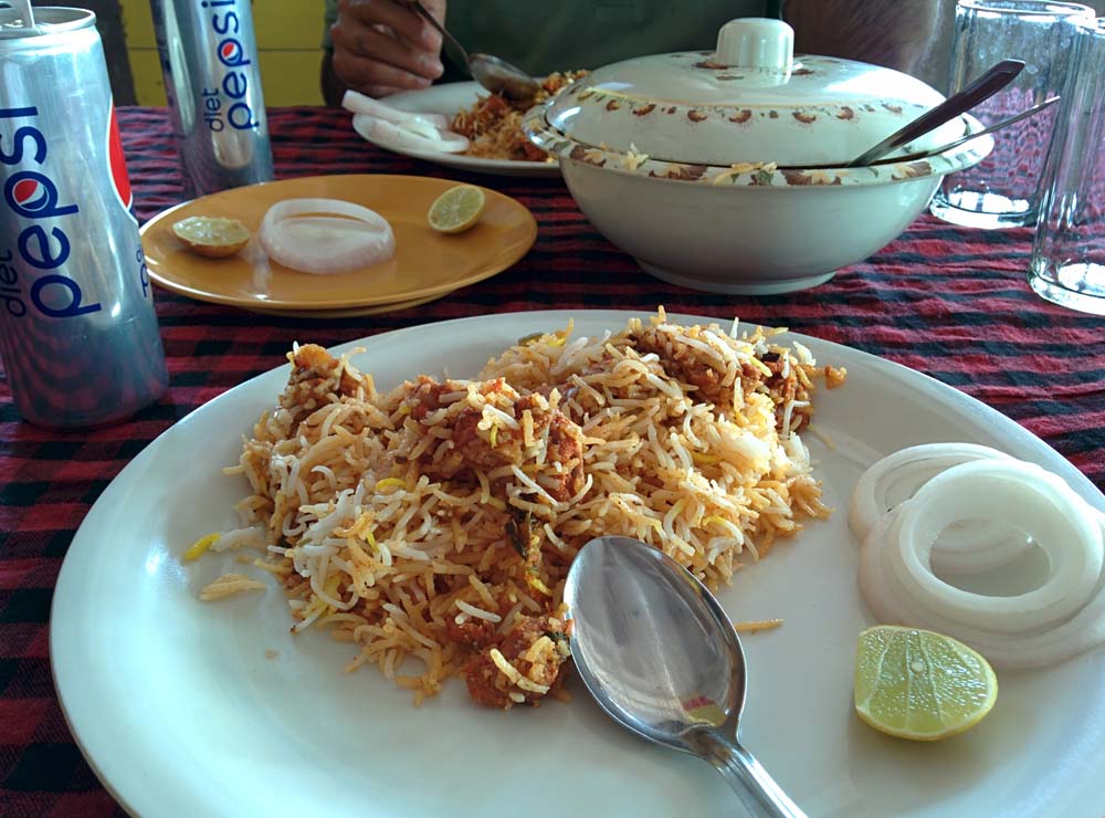 The menu at Pista House is geared for the meat-eater, even though there are some vegetarian options. If you are a fan of kebabs and tikkas and tandoori chicken and biryani, this is the place for you. We’d been keen on having their famous haleem, but were informed that this is made only during Ramzan. We settled, therefore, for their special mutton biryani, which our cab driver had assured us was the best in town. Along with that, two diet Pepsis.