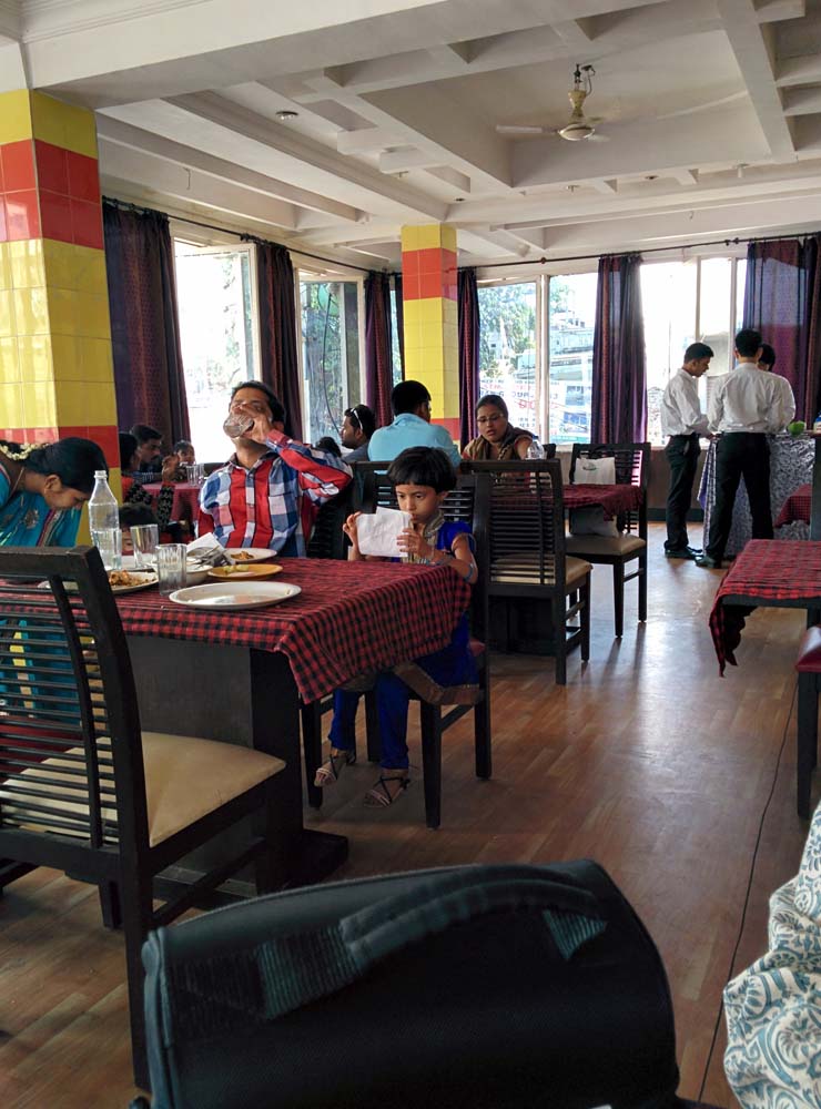 This was just about as barebones as can be: large windows, rather spotty and dusty; grubby red-and-yellow tiled pillars; tables covered with black-and-red checked tablecloths with food stains on them, and mismatched chairs, some of wood and others of plastic. Ceiling fans are suspended over only some of the tables, the only vacant ones being those nearest the toilets—so we seated ourselves as close as we could get to a fan without being near the loos.