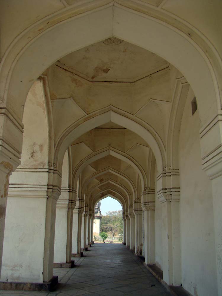 In the arched colonnade of Hayat Baksh Begum's tomb.