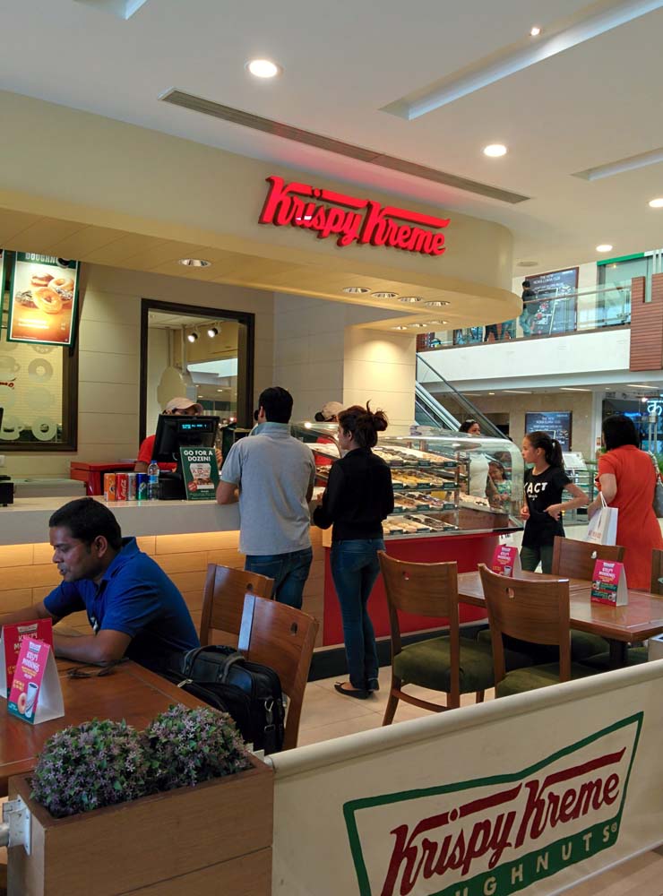 Our doughnuts and coffees cost Rs 558 (inclusive of taxes and service charges). The area is clean, very typical Krispy Kreme-themed, and the doughnuts are (despite the substandard—for me—vanilla cappuccino doughnut) overall very good. The staff is a bit clueless and poorly trained. One server, dishing up the doughnuts, got into an unseemly argument with the colleague who was making the drinks, because they’d got our order mixed up. My husband ended up getting called from one end of the counter to the other a couple of times before they got it all sorted out.