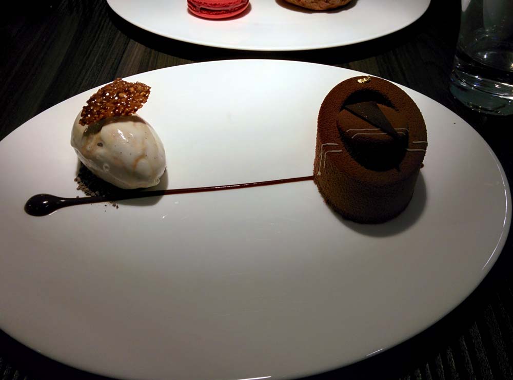 1. Chocolate hazelnut mousse: This was a beautifully turned out mousse, so pretty and perfect, it seemed a shame to eat it. Good flavour, too (and a hidden surprise—a little ball of what seemed like chocolate truffle—at the heart of it). This came with, on the side, a quenelle of vanilla ice cream dotted with little specks of vanilla.