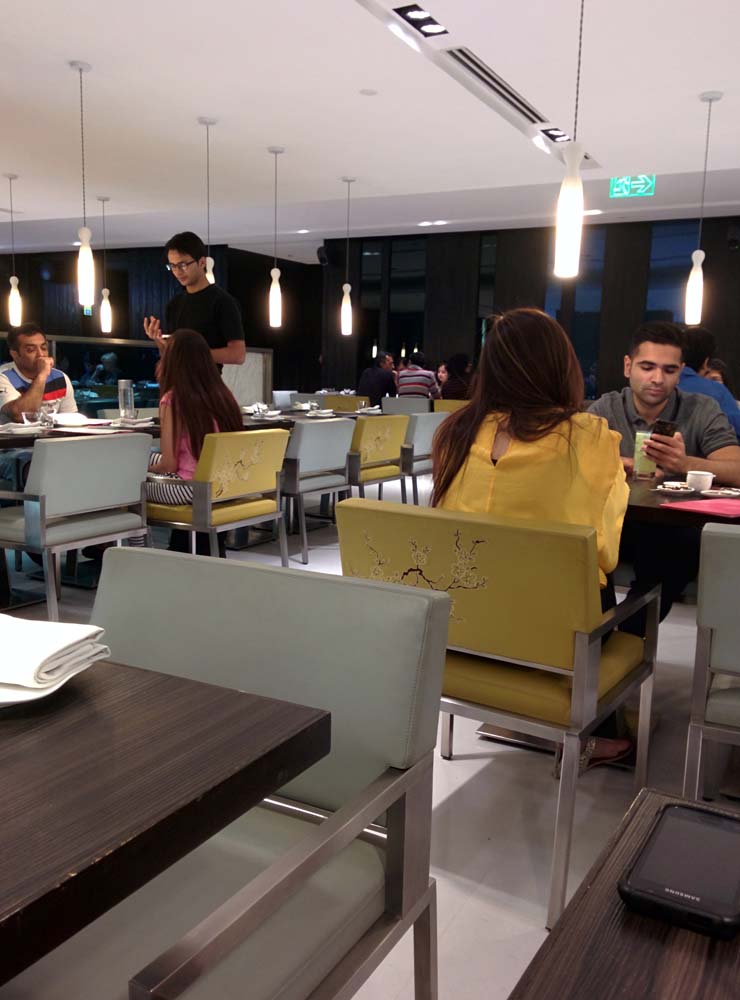 Yauatcha is tucked away in a corner on level 2 of Ambience Mall. The sign, too, is very discreet and low-profile, so you need to keep your eyes open to find this place. Inside, the restaurant is large, spreading around a central bar area gleaming with bottles. Large windows provide a fairly panoramic view of the outside, and the interiors (wood-panelled walls, upholstery in silver-grey and fruit-blossom-printed ochre-gold) are subdued and elegant.