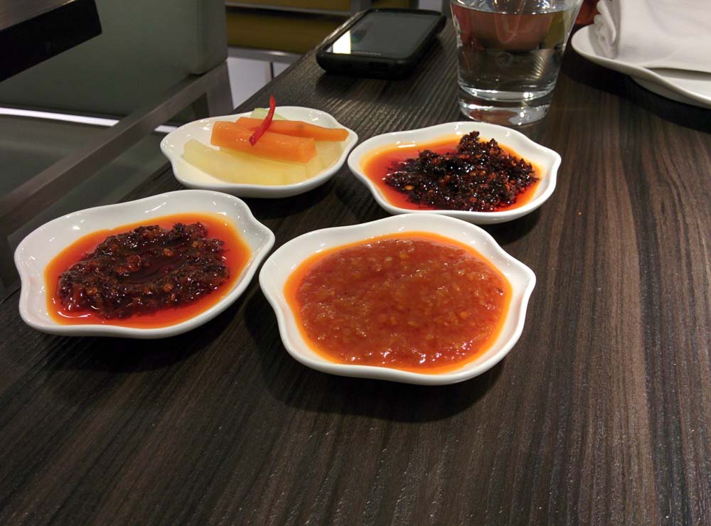 Within minutes, a selection of pickled vegetables and three sauces (burnt chilli, mixed chilli, and a hot garlic sauce) had been placed on our table. While we tasted the pickled vegetables, our starters began arriving, and the meal was on. (One good thing that we appreciated: the timing of the service. We didn’t end up waiting, twiddling our thumbs and getting impatient, at any time. This despite the fact that the restaurant was pretty full and evidently busy).