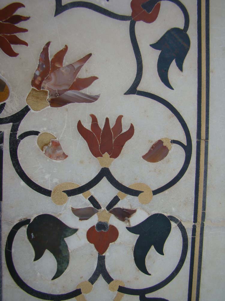 3. Inlay: Also known by its Italian name of pietra dura, and known in India as parchinkari. Parchinkari requires various skills: at the Taj Mahal (probably the finest example in India of parchinkari on such a large scale), for instance, the inlay work would begin with an artist drawing the required pattern on the polished stone surface (such as white marble). The pattern, drawn with henna, would then be used to carve grooves in the stone. The materials for the inlay—semi-precious stones and minerals such as jade, malachite, coral, lapis lazuli, turquoise, mother-of-pearl, etc—would be sliced (using copper wires) into very thin pieces, which would then be fitted into the grooves to form a composite image: a flower, for example.