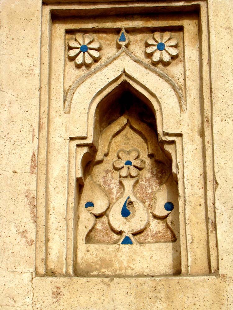 An example of tile work and incised plaster, at Jamaali-Kamaali.
