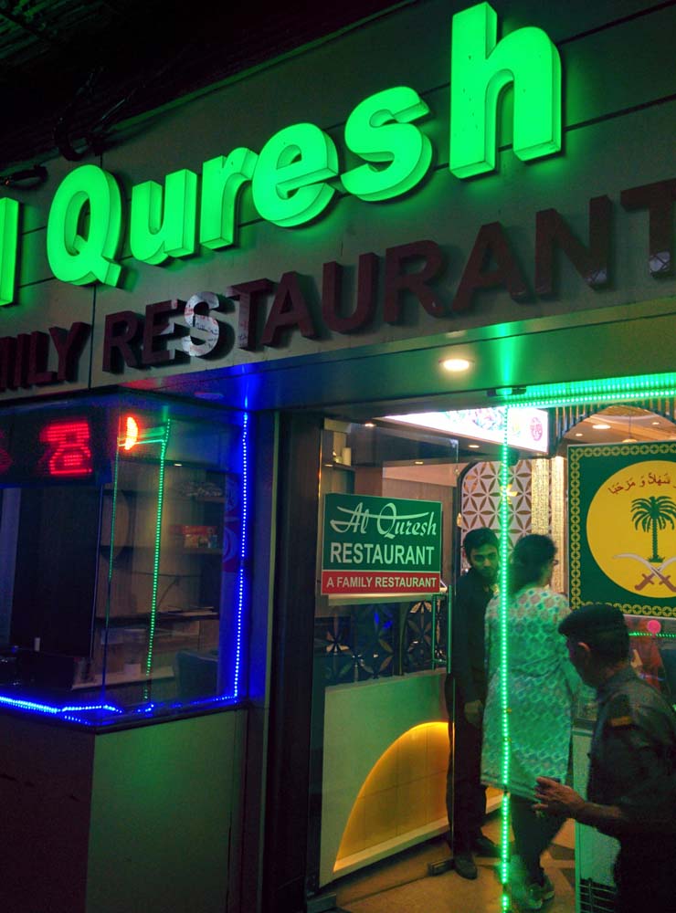 Next up was the last stop on our ‘main course’ round (the sweets were yet to come). This is a restaurant called Al Quresh, at 224 Nizamuddin West (it’s a few shops down from the somewhat better-known Karim’s). Unlike the rest of the places on our itinerary till now, Al Quresh is a proper sit-down restaurant, clean and quite upmarket, what with its hanging lights and smart reception counter (not to mention air-conditioning!).