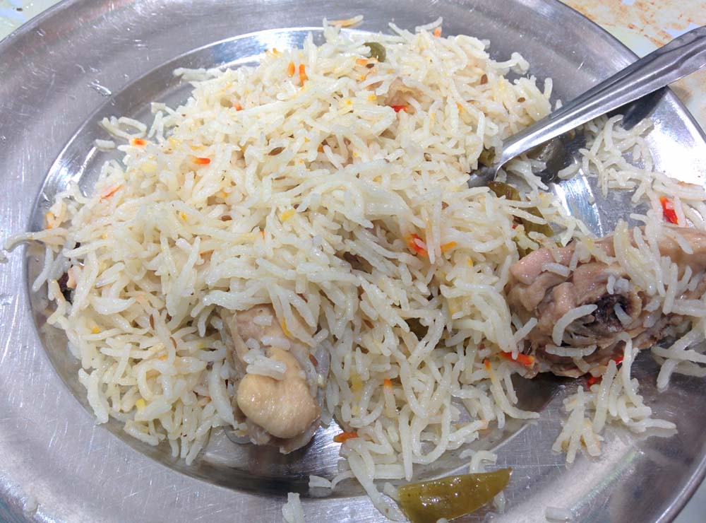 That was the first course. Our next stop, a couple of minutes’ walk back into the basti, on Dargah Road, was a shop called Moradabad ki Mashhoor Biryani ki Puraani Dukaan. There’s an entire row of shops, all of them with their signs lit up with fairy lights and large aluminium cauldrons of biryani cooking outside; the shop I mean is the first on your right if you’re coming from the Dargah—its address is 58A, Dargah Road.