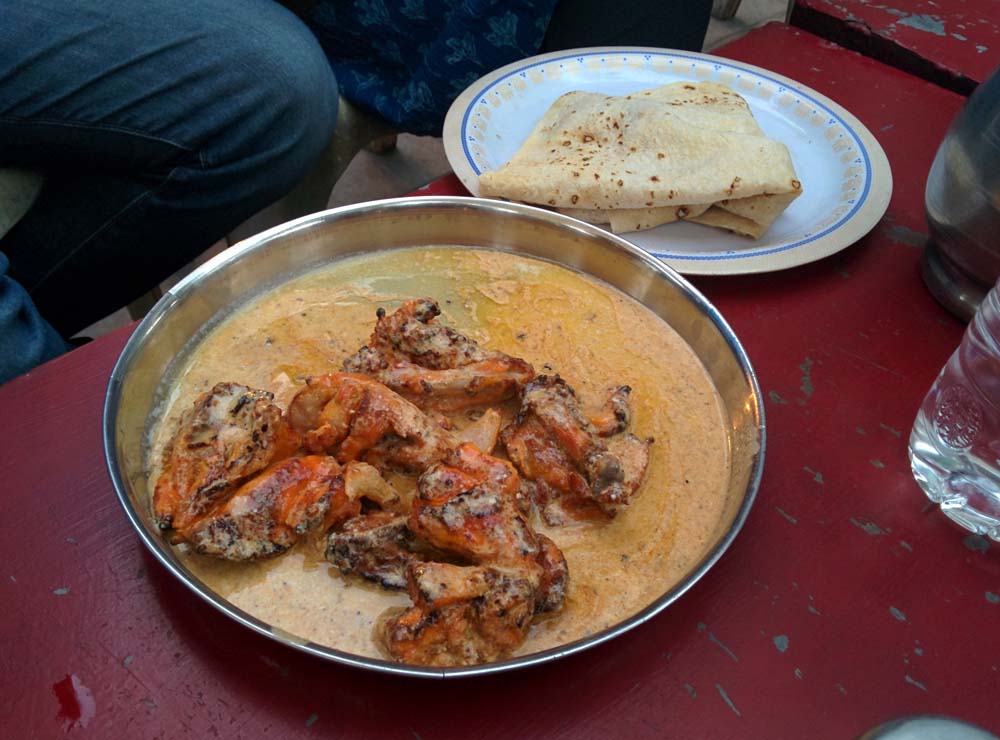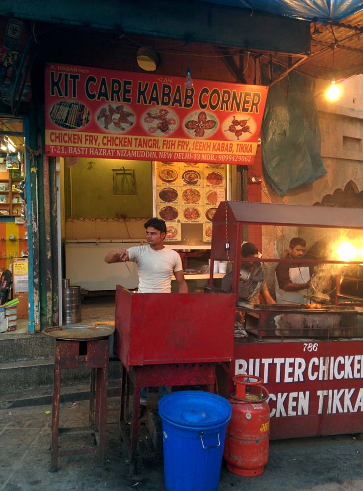 Atgah Khan’s tomb seen, it was time for the food part of the walk to begin. For this, we headed back to our starting point—the Dargah of Hazrat Inayat Khan. Very close to the dargah (a few metres to your left, if you’re facing the main gate of the dargah) was the first stop on the food walk: a small, rather oddly-named kabab stall, Kit Care Kabab Corner (T-21, Phool Waali Gali). Here, while we seated ourselves on plastic chairs, Anubhav ordered for us Kit Care’s specialties: dahi butter chicken and seekh kababs, along with roomali rotis.