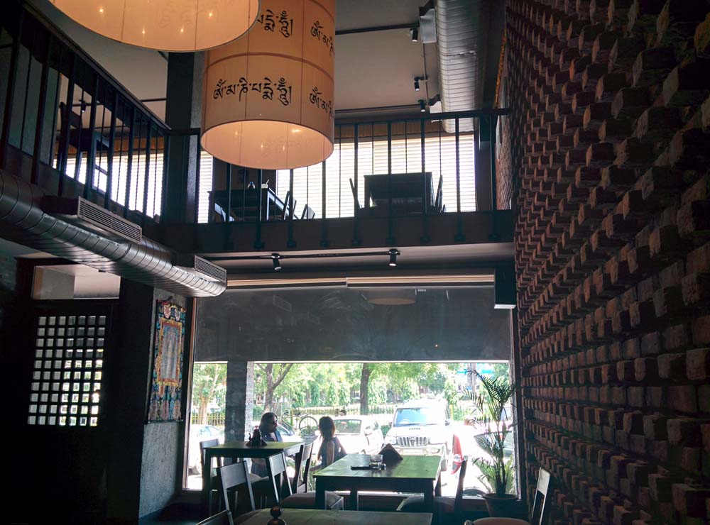 First impressions: this is a far nicer space. It’s more roomy than the Hauz Khas restaurant (which, considering the paucity of space in Hauz Khas, came as no surprise to me). Seating is on two levels, with the upper floor forming a sort of balcony around a high ceiling from which hang tall cylindrical paper lampshades with Tibetan characters (the sacred verse Om mani padme hum, according to someone on an online forum). The walls are stark brick on one side, textured swirls of beige on the other, with very minimal splashes of art to jazz it up: stylish photographs of Tibetan monks, thangkas, Buddhist art, and so on. Elegant, yet with a comforting charm to it that stops it from being intimidating.