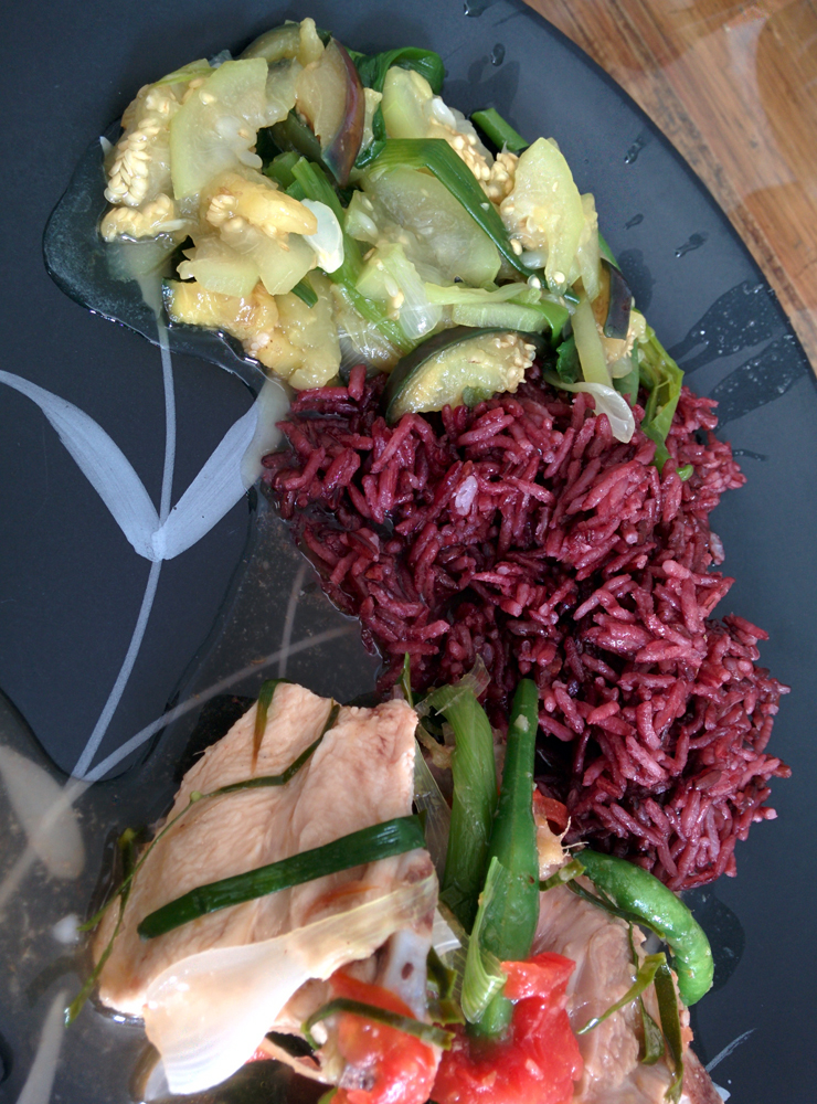 Ten minutes later, straight off the fire and therefore requiring a little blowing on to cool it down, came the kheer. At first glance this looked like a plum conserve sprinkled with raisins: a rich maroon-purple in colour, the rice coarsely ground and cooked with milk, sugar, raisins, and ghee. It was rich, but (I suppose because of the unique flavour of the red rice) had a flavour quite different—in a pleasant way—from North Indian kheer. My husband, whose sugar threshold is low, thought it too sweet, but even he agreed that despite that, this was a nice dessert.
