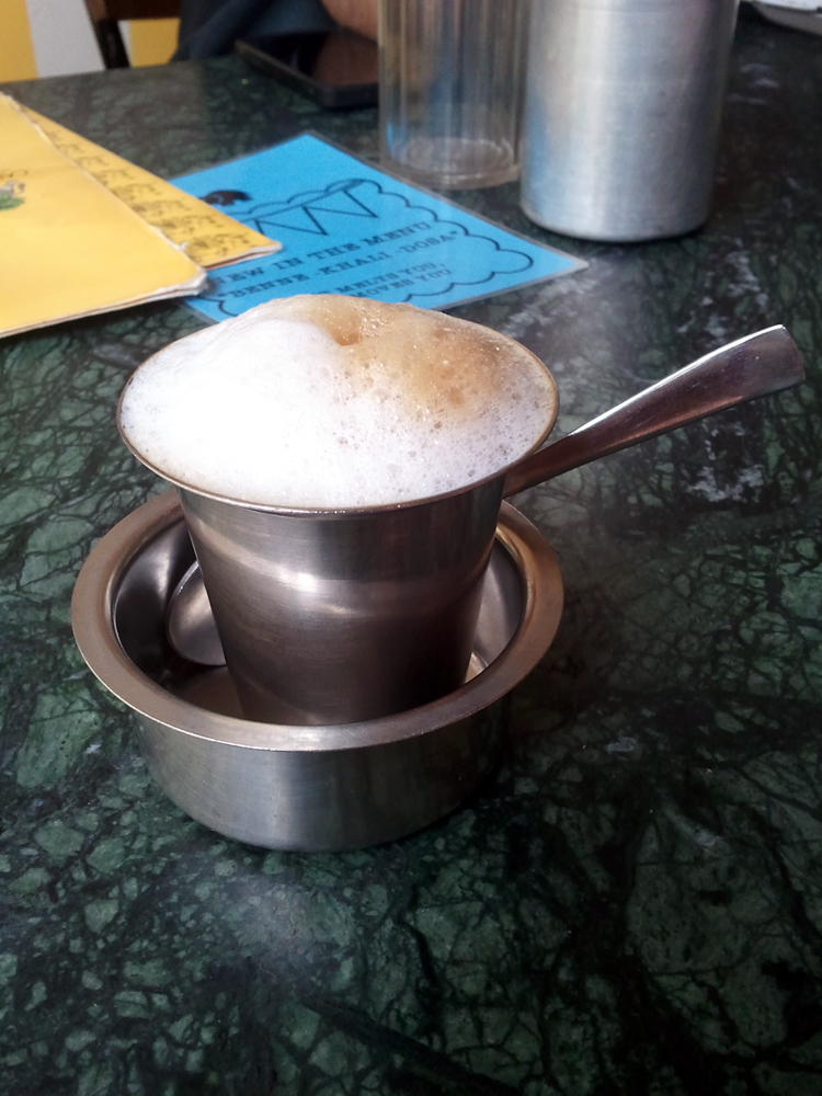 We finished off our meal with filter coffee: good, strong, typical South Indian style kaapi, served frothing in little steel glasses, each of them nestling in its own matching steel katori. Perfect.